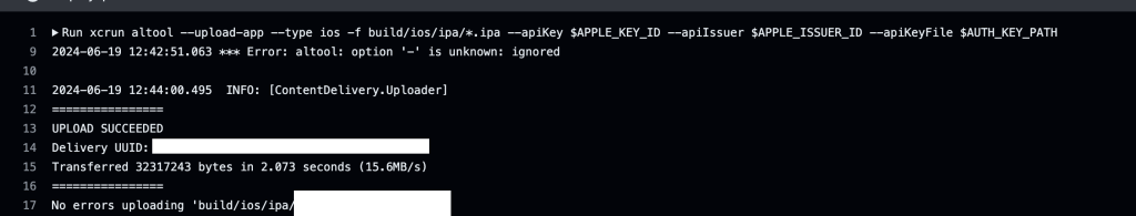 run: xcrun altool --upload-app --type ios -f build/ios/ipa/*.ipa --apiKey $APPLE_KEY_ID --apiIssuer $APPLE_ISSUER_ID --apiKeyFile $AUTH_KEY_PATH